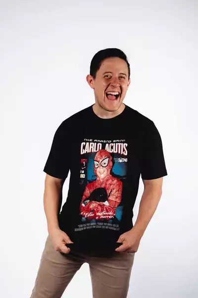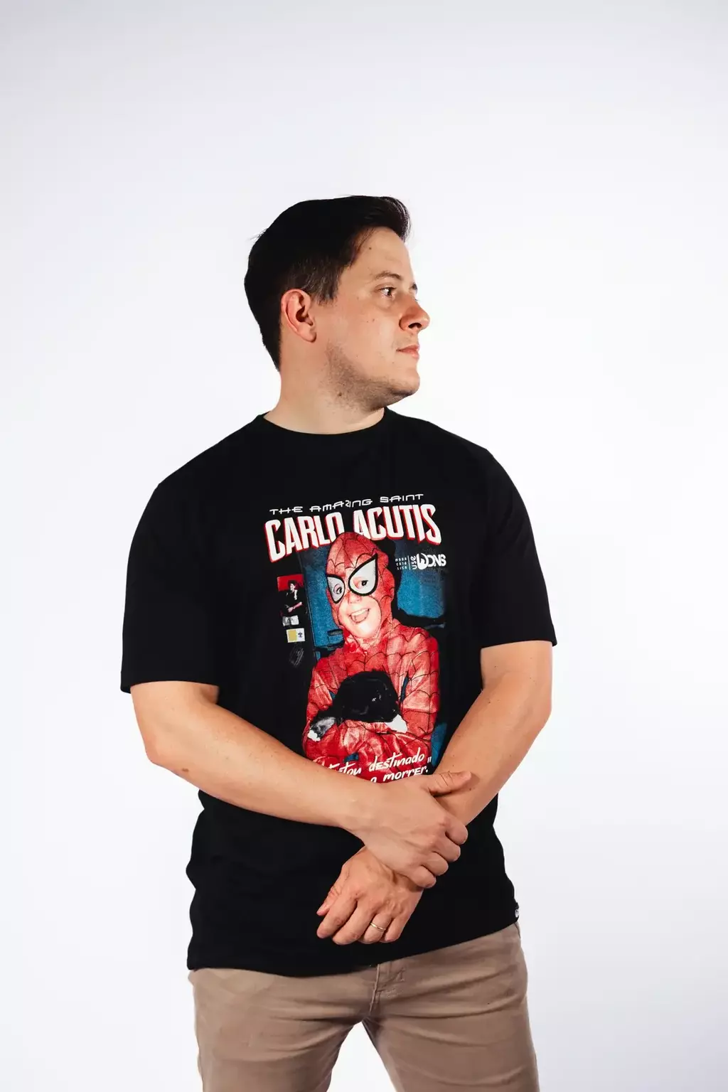 Inspirada no universo geek, especialmente nas camisas de Herois, esta peça única homenageia Carlo Acutis, um jovem santo que é um verdadeiro herói para a juventude. A camiseta traz uma foto do santo ainda criança, vestido como o super heroi, unindo o estilo moderno à mensagem atemporal de santidade.